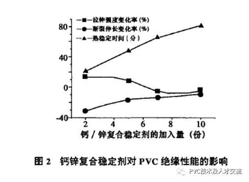 環(huán)保PVC絕緣料的穩(wěn)定劑不能含對(duì)人體有危害的鉛(Pb),鍋CCd}、汞(Hg)、砷(As)、鉻(Cr)、硒(Se)、銻(Sb)等重金屬元素,因此選用無毒的鈣鋅復(fù)合穩(wěn)定劑。鈣鋅復(fù)合穩(wěn)定劑的熱穩(wěn)定性接近或超過某些鋇/鍋穩(wěn)定劑、鉛類穩(wěn)定劑,并且耐候性好、透明性良好。鈣鋅復(fù)合穩(wěn)定劑對(duì)熱穩(wěn)定時(shí)間的影響見表3配方中填充劑25份,潤(rùn)滑劑0.6份,抗氧劑0.6。鈣鋅復(fù)合穩(wěn)定劑的加入量太少材料老化性能不合格,加入量太多成本太高,一般加入5份左右比較合適。