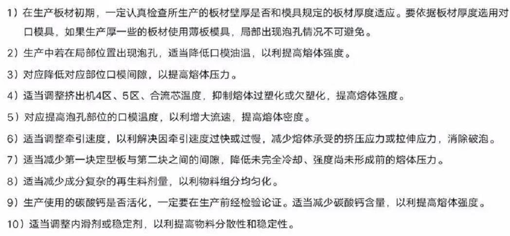 發(fā)泡板材表面出現(xiàn)泡孔,是熔體局部密度過低的表征。一般出現(xiàn)的泡孔有條孔和圓孔兩種表征,影響因素中有樹脂、發(fā)泡劑、調(diào)節(jié)劑、碳酸鈣、穩(wěn)定劑等原料因素,也和模具及工藝有關(guān)。