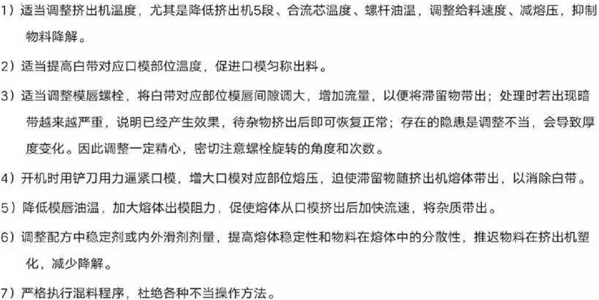 大量實(shí)踐驗(yàn)證,處理白帶有一定時(shí)效性,若處理不及時(shí)或由白帶演變未灰?guī)В蜁?huì)失去處理良機(jī)。處理時(shí)應(yīng)對擠出機(jī)螺桿磨損和裝置情況及近期工藝設(shè)置變動(dòng)情況了如指掌,以便有的放矢應(yīng)對處理。