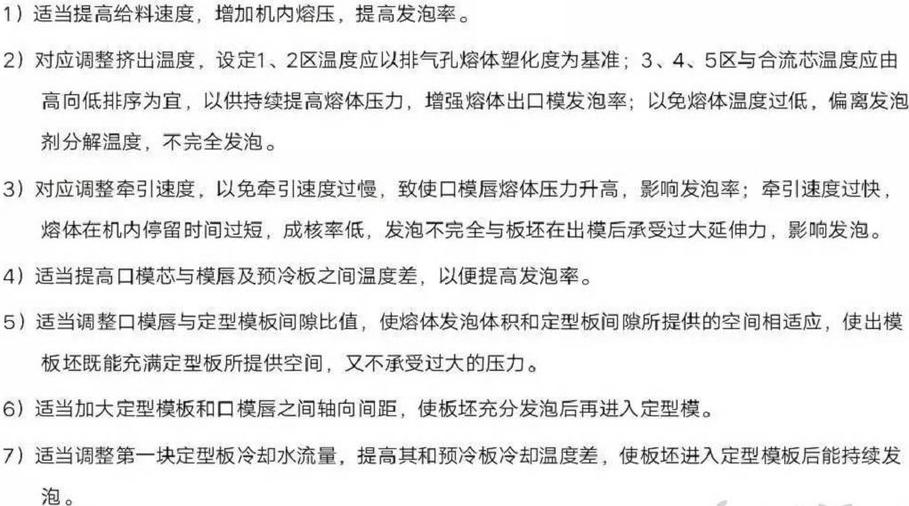 調(diào)整時(shí)應(yīng)根據(jù)生產(chǎn)所需板材質(zhì)量要求,按照程序由簡到繁,由工藝到配方,由減量到加量進(jìn)行逐項(xiàng)對應(yīng)調(diào)整。值得注意的是:調(diào)整提高發(fā)泡率,降低板材密度時(shí)應(yīng)按生產(chǎn)發(fā)泡板的需要各有側(cè)重。以上許多調(diào)整措施,譬如調(diào)整措施4)5)7)8)等都是以犧牲結(jié)皮硬度和光亮度等情況,不可過之而不及,僅僅為降低密度而不考慮結(jié)皮硬度和光亮度。