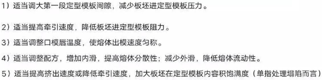 1)口模和白帶對應(yīng)截面間隙設(shè)置偏小,導(dǎo)致流量偏小,熔體從口模擠出時(shí)厚度稍微減薄,經(jīng)過定型板時(shí)未和定型板接觸摩擦出現(xiàn)的白帶。