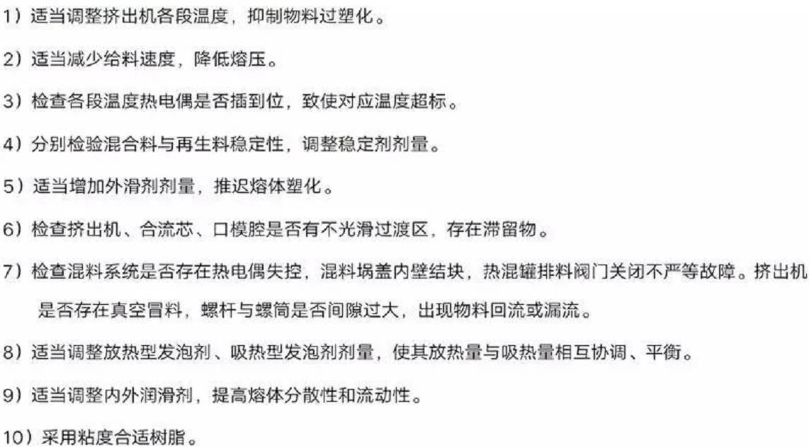 若發(fā)泡制品表面出現(xiàn)大面積泡孔,可適當(dāng)調(diào)整發(fā)泡調(diào)節(jié)劑處理;如在發(fā)泡板表面偶爾出現(xiàn)個(gè)別泡孔,很可能和混料未按混料程序、溫度、加料程序辦事,致使混料不均有關(guān),應(yīng)換料處理;如連續(xù)出現(xiàn)圓形泡孔,應(yīng)適當(dāng)調(diào)整黃白發(fā)泡劑劑量;如發(fā)泡板表面時(shí)而出現(xiàn)長條泡孔,屬于板面局部密度低的表征,原因比較復(fù)雜,應(yīng)依據(jù)發(fā)生泡孔的時(shí)間、部位和概率,從工藝上采取措施處理: