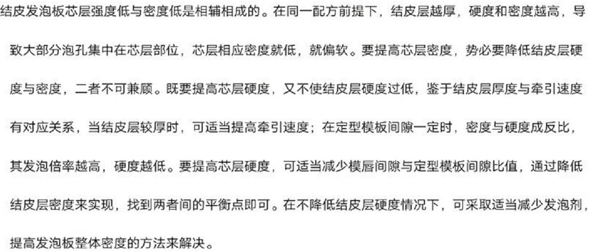 發(fā)泡板芯層強(qiáng)度低質(zhì)量缺陷原因和處理措施: