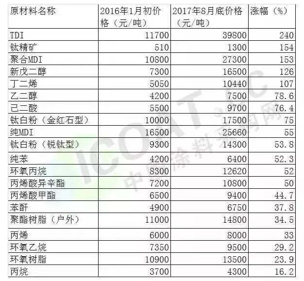 ▲部分大宗化工品漲幅對比,來自中國涂料采購網(wǎng)