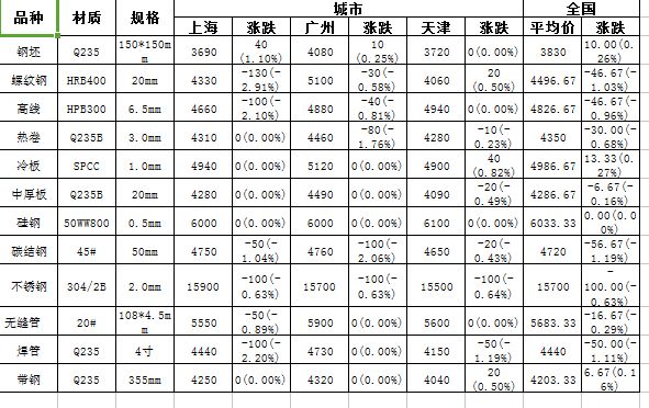 12月27日鋼材重點(diǎn)產(chǎn)品價(jià)格匯總