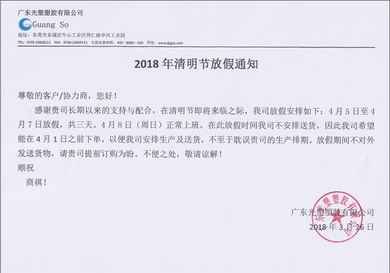 感謝貴司長期以來的支持與配合,在清明節(jié)即將來臨之際,我司放假安排如下:4月5日至4月7日放假,共三天。4月8日(周日)正常上班。在此放假時間我司不安排送貨,因此我司希望能在4月1日之前下單,以便我司安排生產(chǎn)及送貨,不至于耽誤貴司的生產(chǎn)排期。放假期間不對外發(fā)送貨物,請貴司提前訂購為盼。不便之處,敬請諒解!