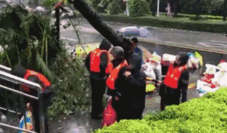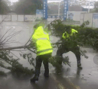 為了市民們的行車安全,交警蜀黍們正在努力清除被大風(fēng)吹倒的樹