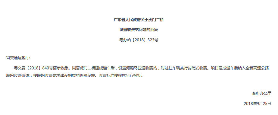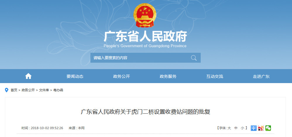 10月2日,即在國(guó)慶節(jié)假日期間,廣東省人民政府門(mén)戶(hù)網(wǎng)站加班加點(diǎn)發(fā)布重磅公告,即有關(guān)虎門(mén)二橋設(shè)置收費(fèi)站問(wèn)題已獲省府批復(fù),為明年虎門(mén)二橋的開(kāi)通前期準(zhǔn)備工作全面加速同步推進(jìn),預(yù)計(jì)虎門(mén)二橋?qū)⒂诿髂晟习肽杲ǔ赏ㄜ?chē),通車(chē)后打通珠江兩岸交通瓶頸,極大緩解目前虎門(mén)大橋的擁堵?tīng)顩r。