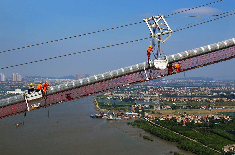 在大沙水道,193米高的東塔從江面直沖云霄。項(xiàng)目施工方相關(guān)負(fù)責(zé)人介紹:“主塔共分41節(jié),每節(jié)精度誤差不超過(guò)10毫米。受廣東炎熱天氣的影響,測(cè)量監(jiān)控和混凝土澆筑一般都在晚上進(jìn)行。”如果把橋梁比作一桿秤,錨碇就相當(dāng)于秤砣,橋梁的荷載主要由橋兩端的秤砣來(lái)承受。在東錨碇施工中,施工方用了5900噸鋼筋,混凝土澆筑方量18.6萬(wàn)方,相當(dāng)于62個(gè)標(biāo)準(zhǔn)游泳池,重量達(dá)到46.5萬(wàn)噸,經(jīng)過(guò)無(wú)數(shù)次的模板搭建和澆筑才完成。