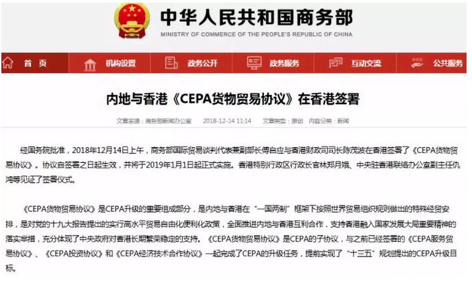 經(jīng)國(guó)務(wù)院批準(zhǔn),2018年12月14日上午,商務(wù)部國(guó)際貿(mào)易談判代表兼副部長(zhǎng)傅自應(yīng)與香港財(cái)政司司長(zhǎng)陳茂波在香港簽署了《CEPA貨物貿(mào)易協(xié)議》。