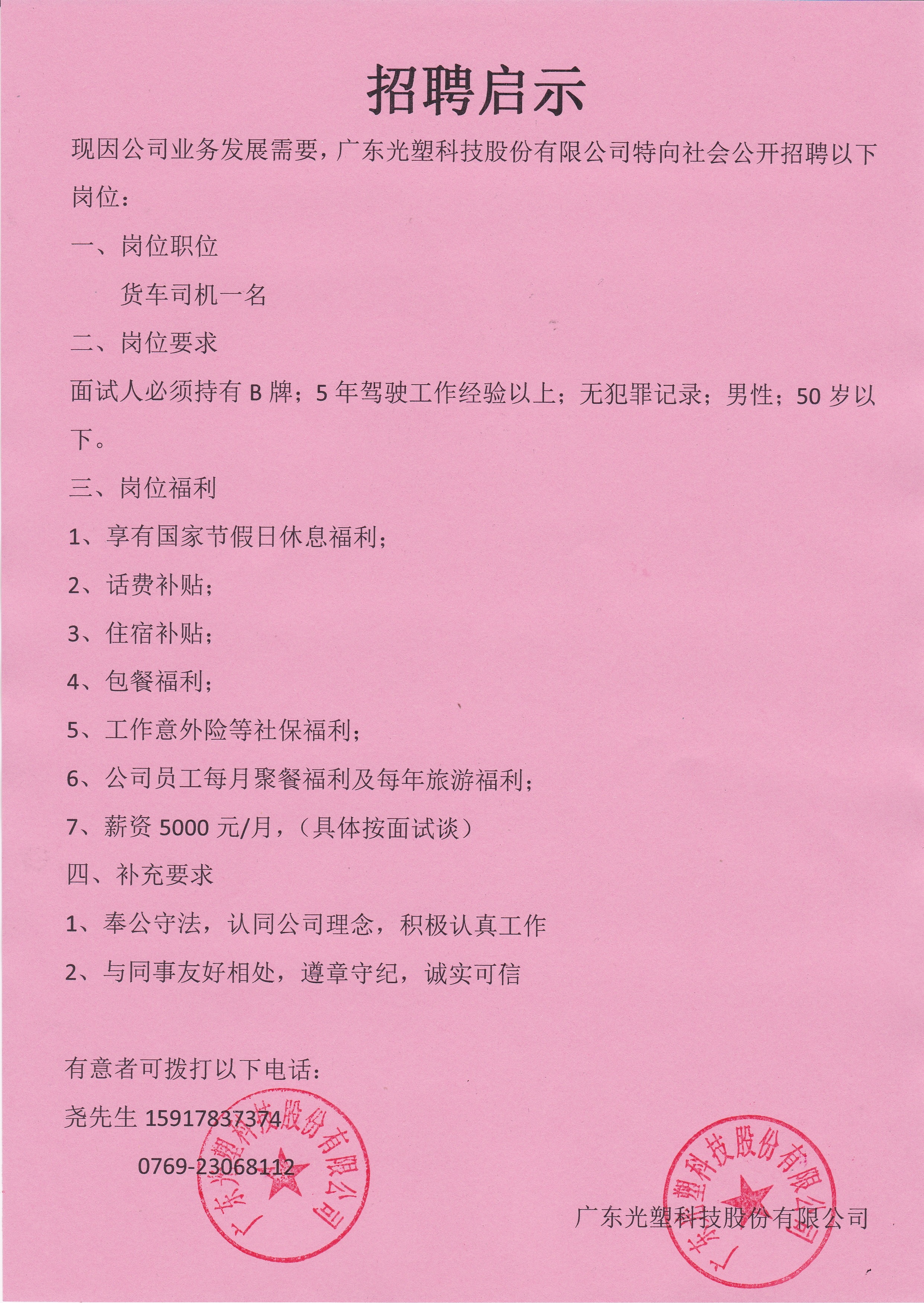因公司需要,現(xiàn)面向社會(huì)公開(kāi)招聘貨車(chē)司機(jī)一名;要求:男性,50歲以下,5年以上駕駛工作經(jīng)驗(yàn),持有B牌,無(wú)犯罪記錄。一經(jīng)錄取享有公司各種福利待遇。
