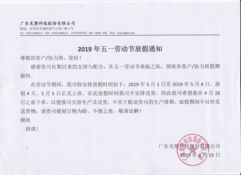 感謝貴司長期以來的支持與配合,在五一勞動節(jié)來臨之際,預(yù)祝各客戶/協(xié)力商假期愉快。在勞動節(jié)期間,我司特安排放假時間如下:2019年5月1日至2019年5月4日,放假4天。5月5日正式上班,在此放假時間我司不安排送貨,因此我司希望能在4月26日之前下單,以便我司安排生產(chǎn)及送貨,不至于耽誤貴司的生產(chǎn)排期。放假期間不對外發(fā)送貨物,請貴司提前訂購為盼。不便之處,敬請諒解!