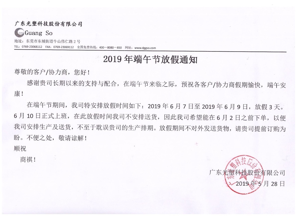 尊敬的客戶/協(xié)力商,您好!感謝貴司長期以來的支持與配合!在端午節(jié)來臨之際,預(yù)祝各位客戶/協(xié)力商假期愉快,端午安康。在端午節(jié)放假期間,我司特安排放假時(shí)間如下:2019年6月7日至2019年6月9日放假,共三天,上班時(shí)間為2019年6月10日。因此我司特希望各客戶能在6月2日前下單,以便我司安排生產(chǎn)及送貨,不至于耽誤貴司生產(chǎn)排期。放假期間不對外發(fā)送貨物,請貴司訂購為盼。不便之處,敬請諒解!